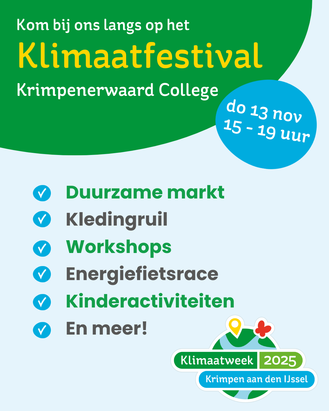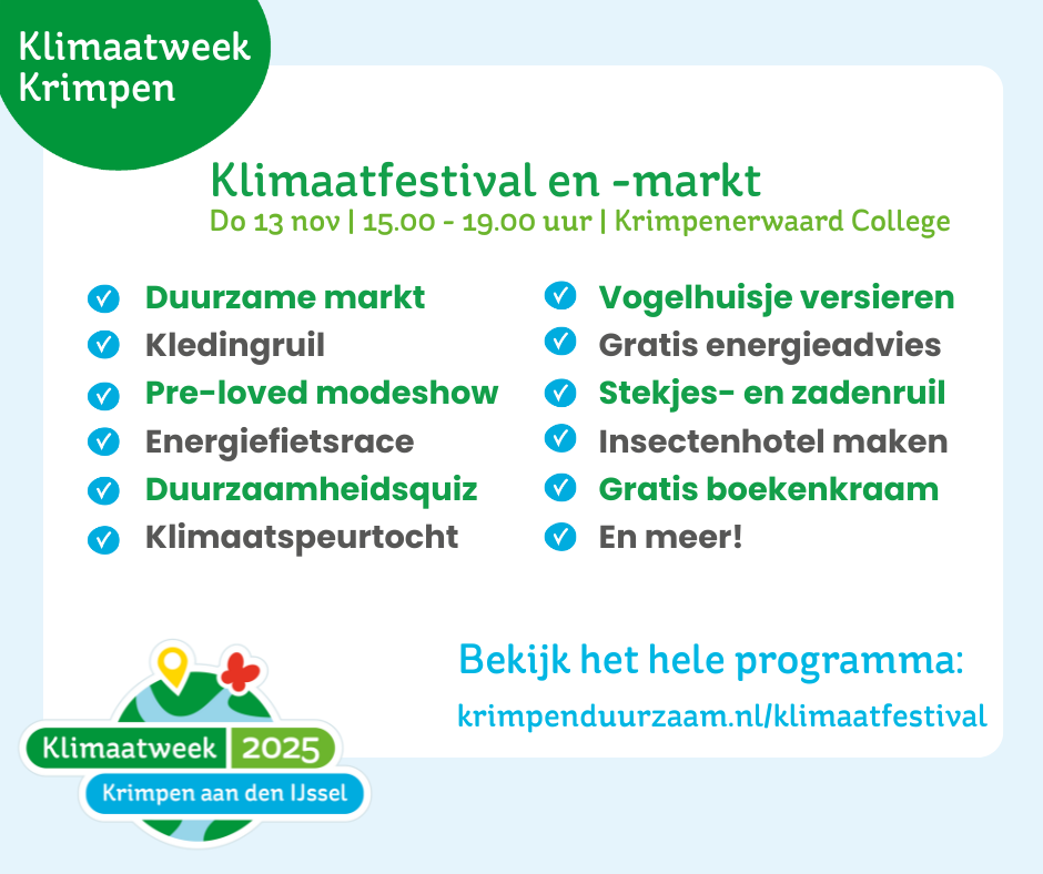Van 10 – 16 november is het Klimaatweek in Krimpen. Dus is er weer heel veel leuks te doen, te leren en te ontdekken voor jong en oud(er). Heel veel activiteiten en bijna allemaal gratis. Soms moet je je alleen even aanmelden. Bekijk het programma op krimpenduurzaam.nl/klimaatweek en zet jouw groene stap!